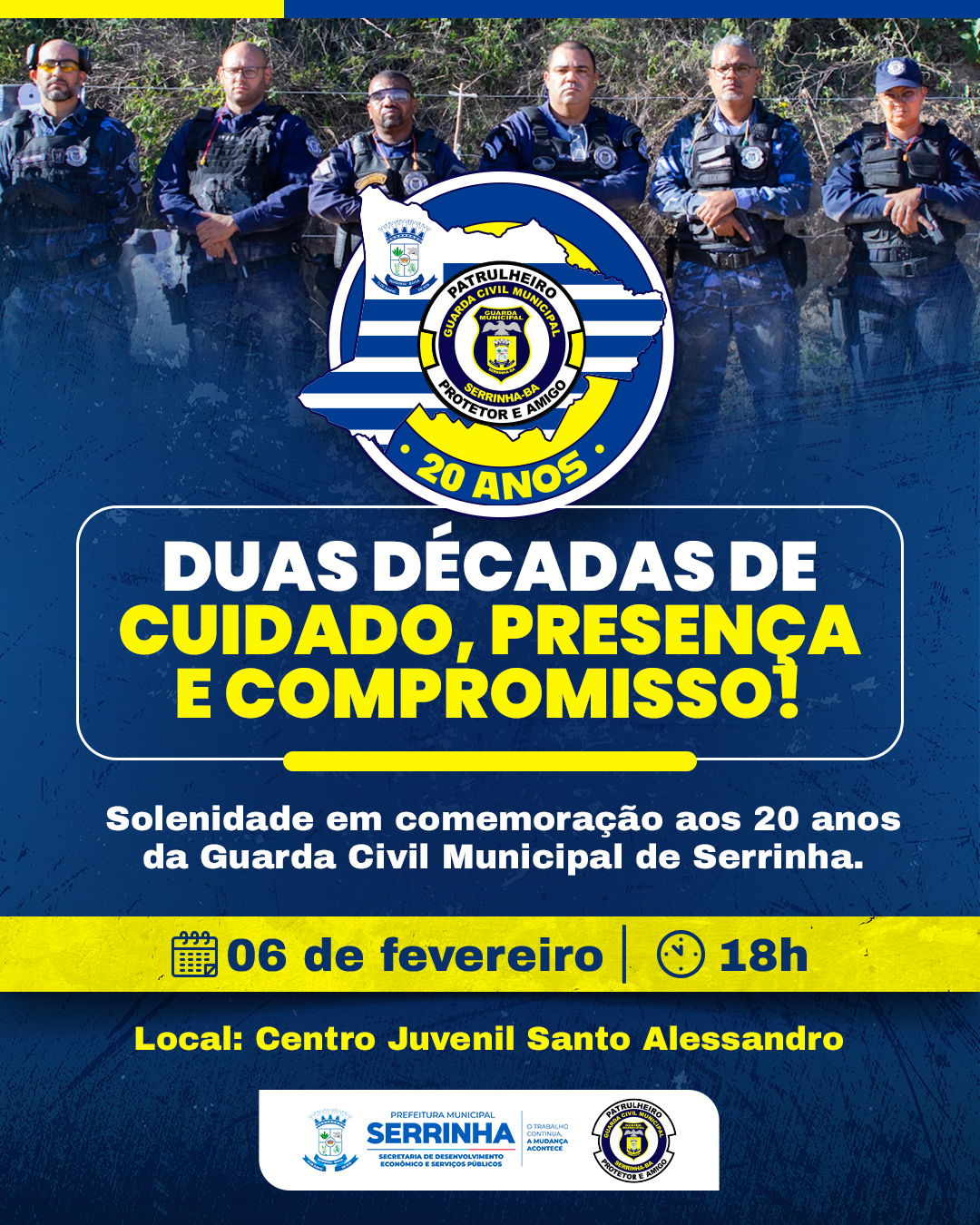 A Guarda Civil Municipal de Serrinha completa, no próximo dia 02 de fevereiro, 20 anos de uma trajetória marcada pela presença constante nas ruas, pela proteção do patrimônio público e, principalmente, pelo cuidado diário com a população serrinhense.